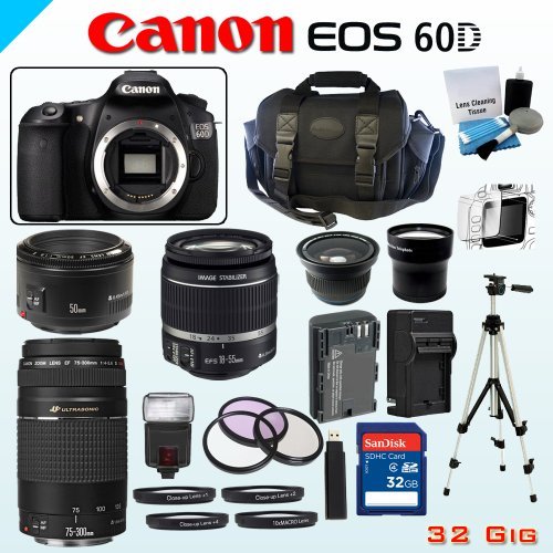 are you looking for best ? Canon 18MP EOS 60D Bundle - Includes Canon EF-S 18-55mm Lens - Canon EF 75-300mm f/4-5.6 III Lens - Canon EF 50mm f/1.8 Lens - Wide Angle and Telephoto Zoom Lenses - 32GB SDHC Memory Card - USB Memory Card Reader - Spare LP-E6 Lithium Battery - 3 Piece Lens Filter Set - 4 Piece Macro Lens Kit - Digital Flash - Screen Protector - Lens Cleaning Kit - Full Size Tripod - Carrying Case is our best choice- Canon 60D