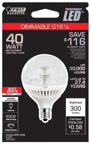 are you looking for best products ? Feit Electric BPG161/2/CL/DM/LED LED Light Bulb, Candelabra E12, 4.8W (40W Equivalent) Dimmable 3000K 300 Lumens is our best choice- BPG161/2/CL/DM/LED GLOBE . . . that's product is top for you, because product are designed to provide good quality. you can compare about this more product image and reviews fully , You can find this products from best stores like amazon to make deal this products or similar products online.